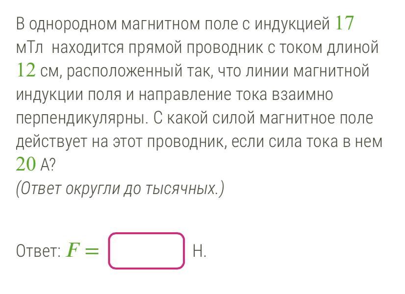Объяснение:F=BIL sinα=0,017 Тл* 0.12м*20А*1=0,041 Н
