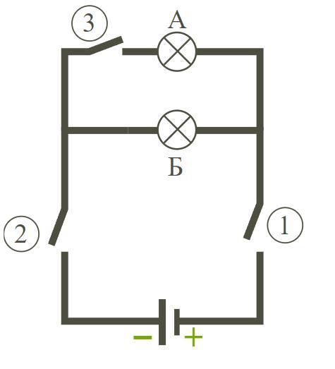 При одновременном замыкании ключа 3 и ключа 1 лампочка Б ... .