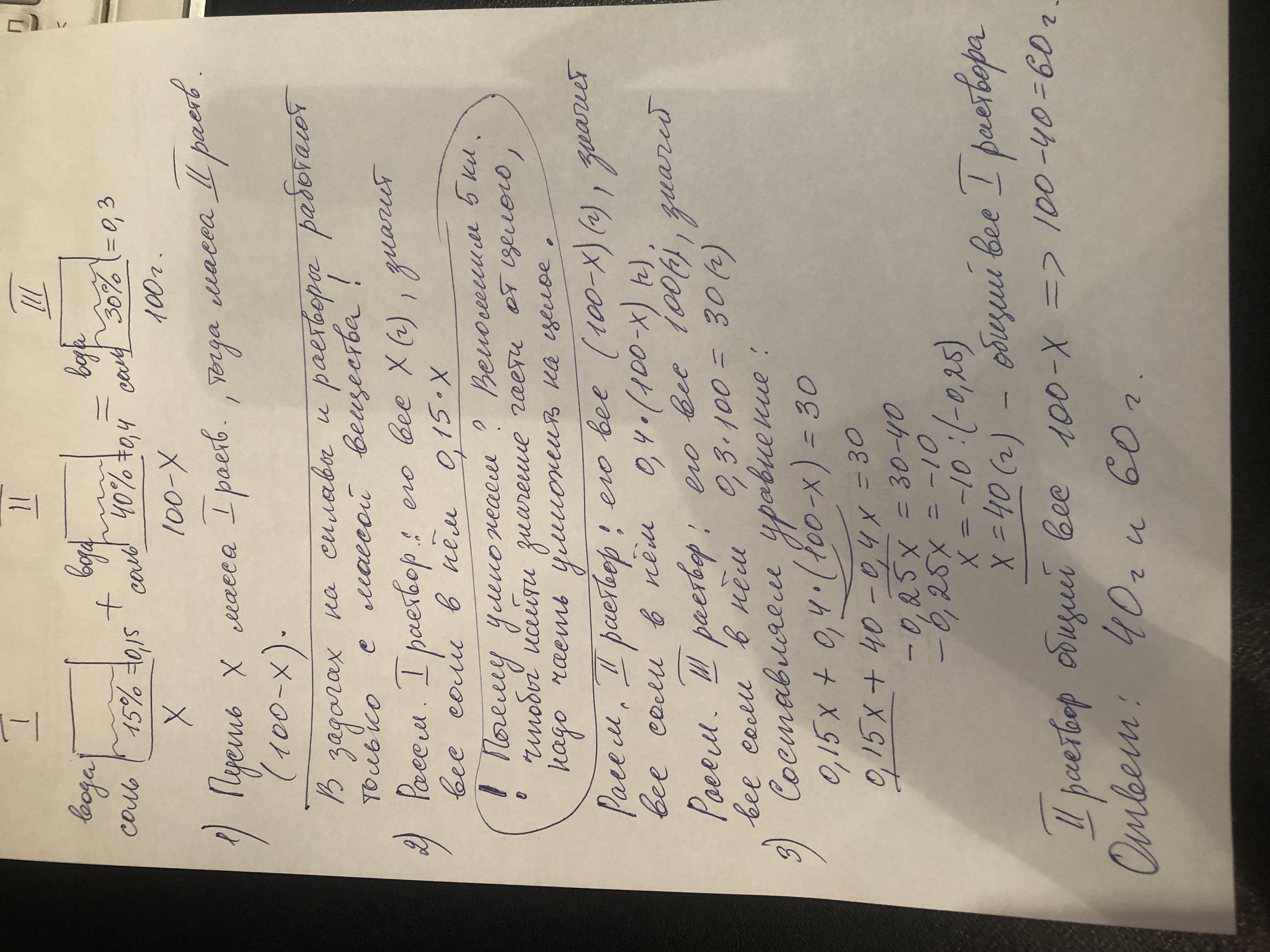 Смешивание 15% и 40% солевых растворов дает 100 г 30% солевого раствора. Сколько граммов было взято из каждого раствора?
