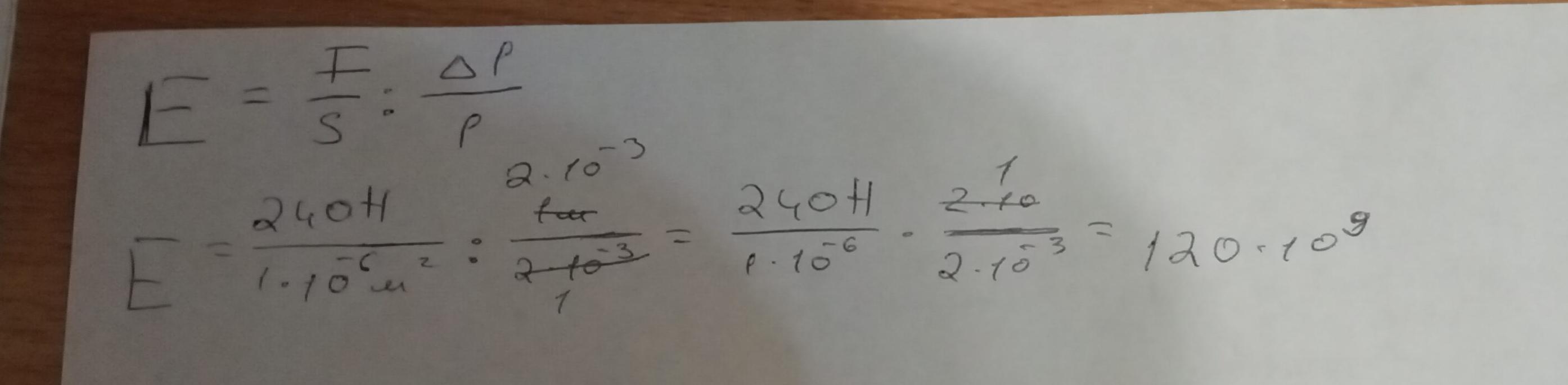 Найдите модуль Юнга для материала из которого сделана проволока длиной 1 м и площадью поперечного сечения 1 мм 2 , которая удлиняется на 2 мм под действием силы 240 Н.