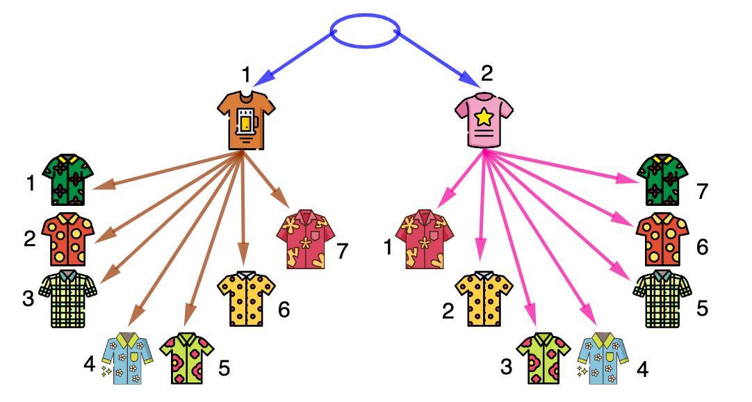 Можно выбрать любую из двух футболок, поэтому из корня дерева проведем две ветви.