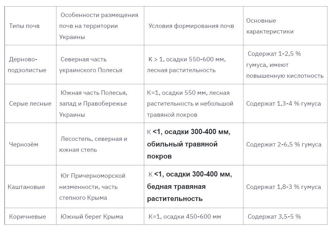 Ответ.Використовуючи карту ґрунтів та текст підручника, таблиця ХАРАКТЕРИСТИКА ОСНОВНИХ ТИПІВ ҐРУНТІВ УКРАЇНИ дана нижче у додатку.