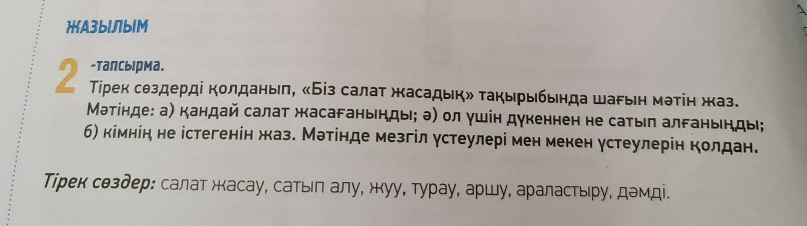 -Тапсырма. 2 Тірек сөздерді қолданып, «Біз салат жасадық» тақырыбында шағын мәтін жаз. б) кімнің не істегенін жаз. Мәтінде мезгіл үстеулері мен мекен үстеулерін қолдан. Мәтінде: а) қандай салат жасағаныңды; ә) ол үшін дүкеннен не сатып алғаныңды; Тірек сөздер: Салат жасау, сатып алу, жуу, турау, аршу, араластыру, дәмді. ПЖ составьте не текст, а диалог