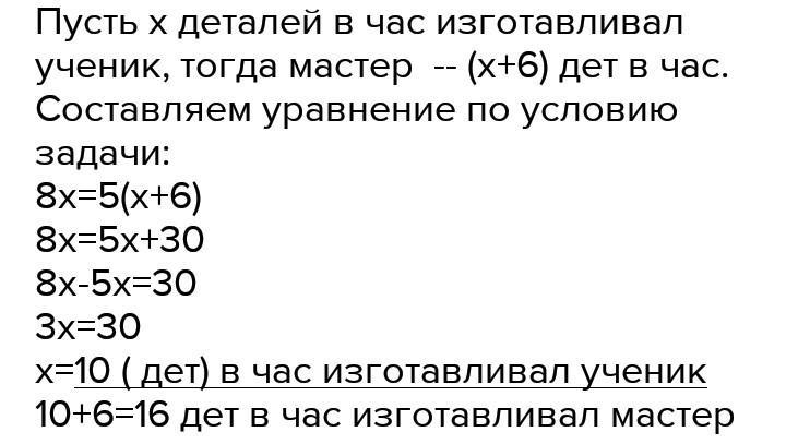 ученик за 8 ч работы сделал столько же деталей, сколько мастер за 5 ч. Сколько деталей в час изготовил ученик, если известно, что мастер изготовлял в час 6 деталей больше, чем ученик?
