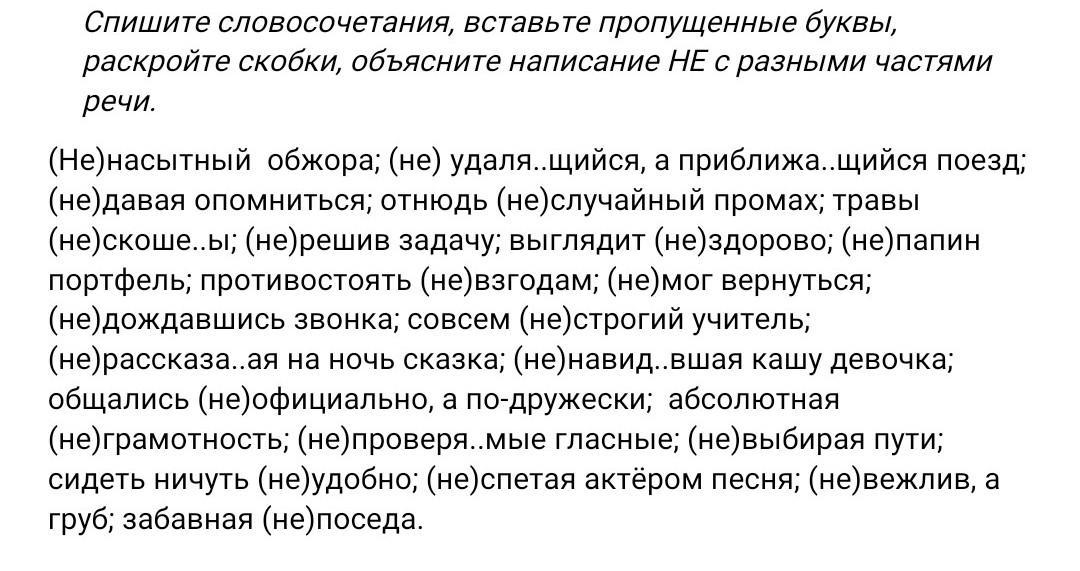 Ненасытный (не употребляется без НЕ) обжора; не удаляющийся, а приближающийся поезд (противопоставление с союзом а) ; не давая опомниться (с деепричастиями раздельно) ; отнюдь не случайный промах (отнюдь не); травы не скошены (с краткими причастиями раздельно) ; не решив задачу (деепричастие); выглядит нездорово (можно подобрать синоним: плохо); не папин портфель (с притяжательными прилагательными раздельно) ; противостоять невзгодам (не употребляется без не), не мог вернуться (с глаголами раздельно), не дождавшись звонка (с деепричастиями раздельно), совсем не строгий учитель (совсем не), не рассказанная на ночь сказка (есть зависимое слово), ненавидевшая кашу девочка (не употребляется без не), общались не официально, а по-дружески (противопоставление с союзом а), абсолютная неграмотность (можно подобрать синоним: безграмотность), непроверяемые гласные, не выбирая пути (деепричастие), сидеть ничуть не удобно (ничуть не), не спетая актёром песня (есть зависимое слово), не вежлив, а груб (противопоставление с союзом а), забавная непоседа (не употребляется без не)