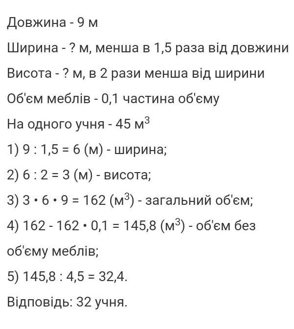 1547. За санітарними нормами на кожного учня у класі повинно припадати не менш як 4,5 м3 повітря. Скільки учнів можна розмістити в кабінеті, довжина яко- го 9 м, ширина менша від довжини в 1,5 раза, а висота у 2 рази менша від ширини? Врахуйте, що об'єм меблів займає десяту частину об'єму кабінету.
