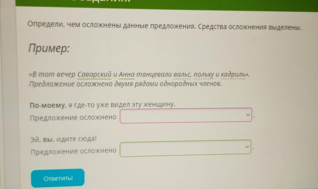 Условие задания: Определи, чем осложнены данные предложения. Средства осложнения выделены. Пример: «В тот вечер Саварский и Анна танцевали вальс, польку и кадриль». Предложение осложнено двумя рядами однородных членов. По-моему, я где-то уже видел эту женщину. Предложение осложнено Эй, вы, идите сюда! у Предложение осложнено Ответить!