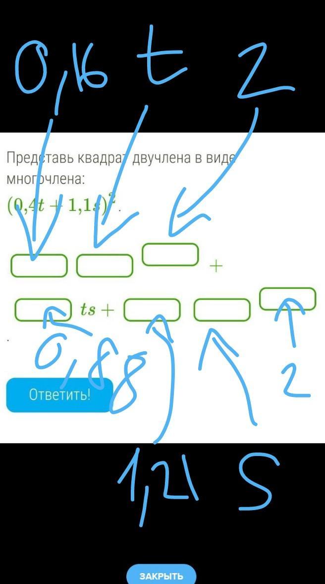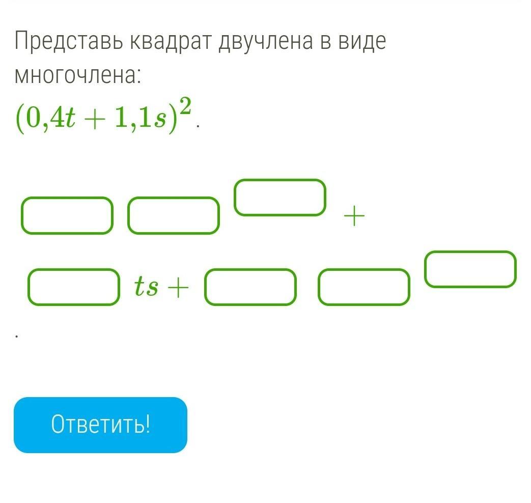 (0,4t+1,1s)²=(0,4t)²+2×0,4×1,1×t×s+(1,1s)²= 0,16 ×t²+0,88ts+1,21s²