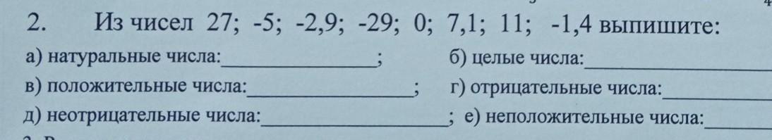 Из чисел 27; -5; -2,9; -29; 0; 7,1; 11; -1,4 выпишите: а) натуральные числа: б) целые числа: в) положительные числа: г) отрицательные числа: д) неотрицательные числа: е) неположительные числа: