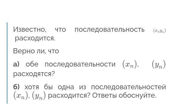 б) Предположим противное: пусть обе последовательности сходятся, то есть . Но тогда по арифметическим свойствам предела