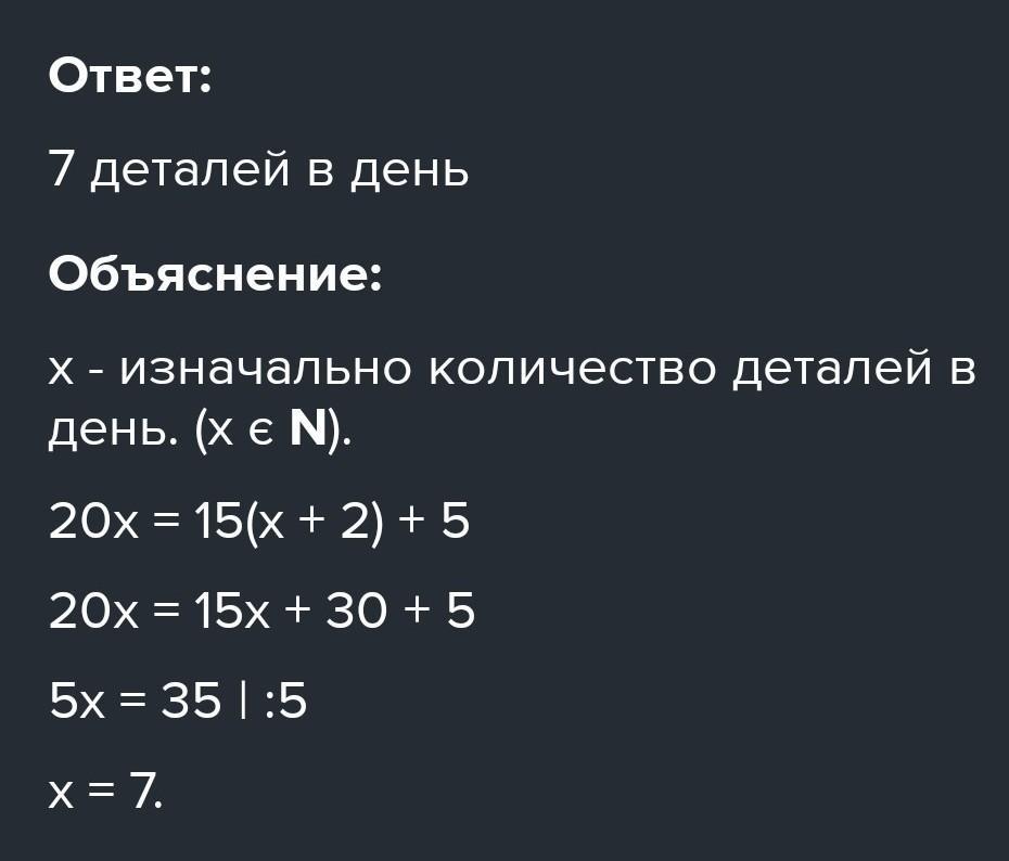 Рабочие должны были выполнить заказ за 20 дней. Ежедневно, они делали на 2 детали больше, чем должны, поэтому за 15 дней они не только выполнили задание, но ещё и изготовили на 5 деталей больше. Сколько деталей в день планировала делать бригада?