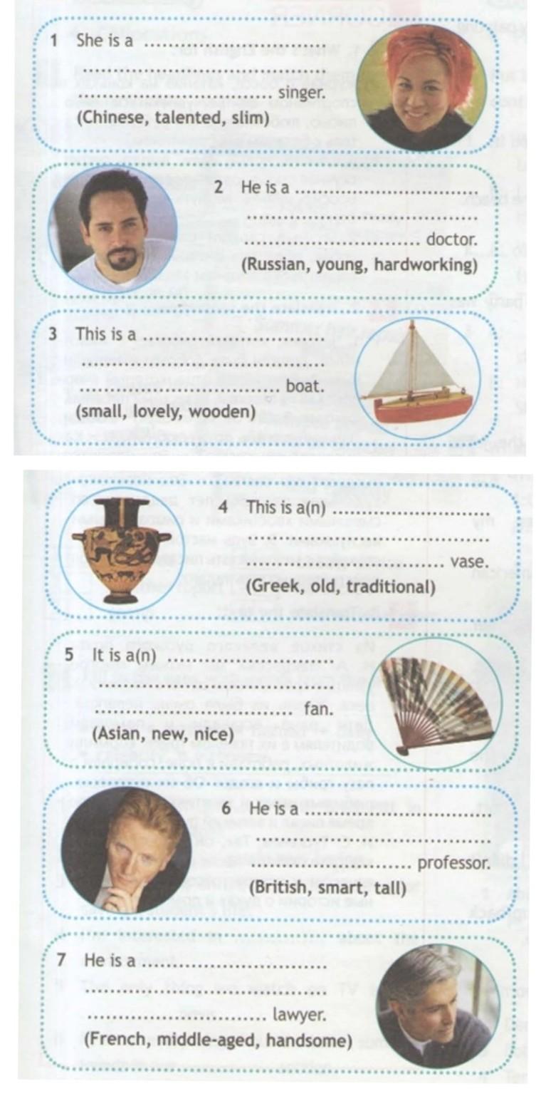1. She is a slim talented Chinese.2. Hе is a young hardworking Russian doctor. 3. This is a lovely small wooden boat. 4.This is a traditional old Greek vase. 5.It is a nice new Asian fan. 6. He is a tall smart British professor. 7. He is a handsome middle-aged French