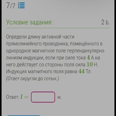 F = I * L * B; L = F / IB = 10 Н / 4 А * 44 Тл ≅ 0,06 м