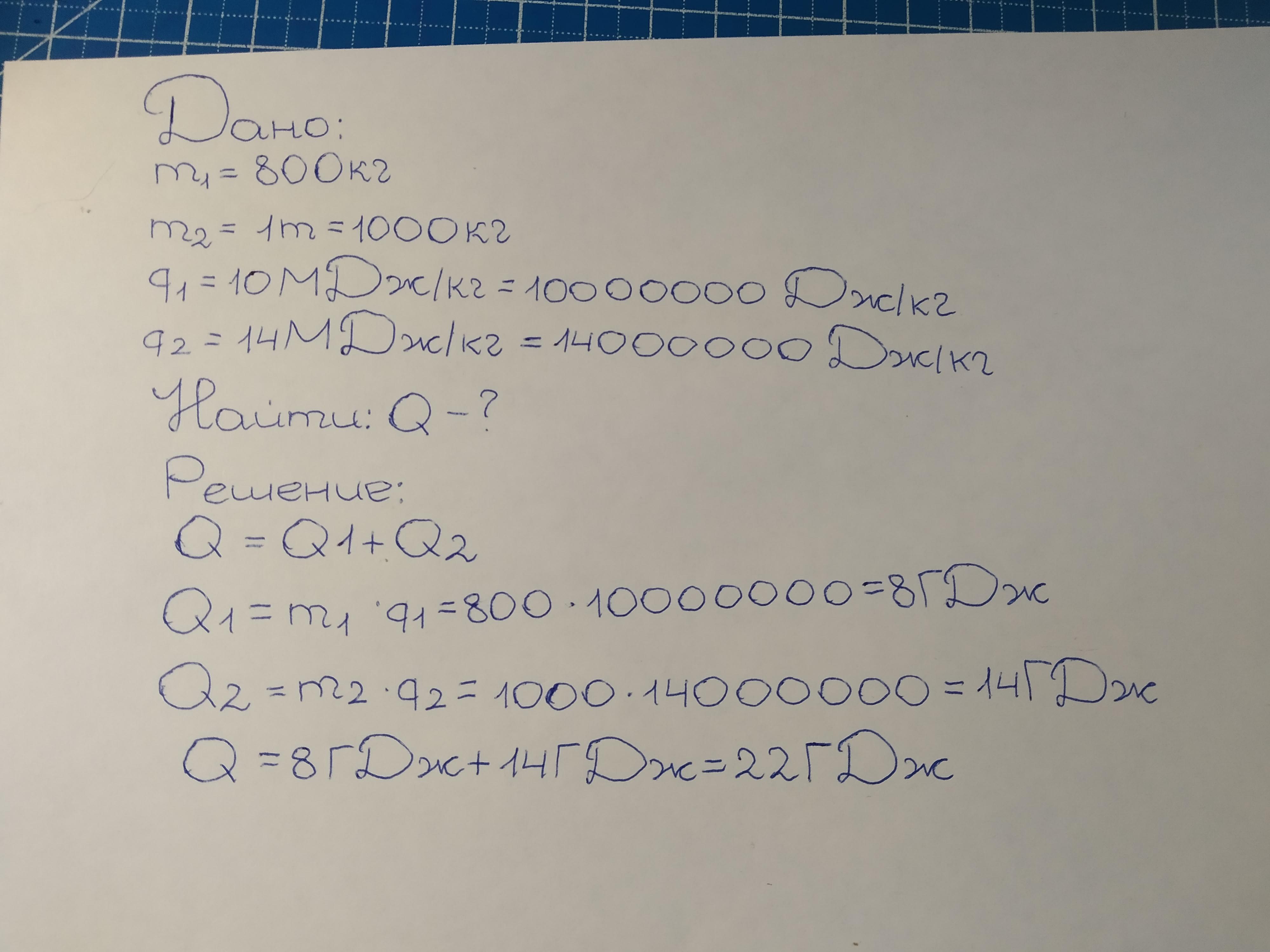 Сколько энергии выделилось при полном сгорании m1=800 кг дров и m2=1 т торфа? Значения удельной теплоты сгорания дров и торфа равны q1=10 МДж/кг и q2=14 МДж/кг соответственно.