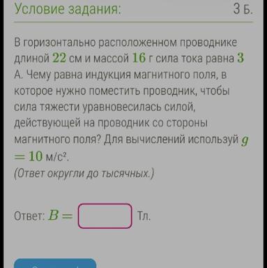 Отсюда B = mg / IL = 0,016 кг * 10 м/с² / 3 А * 0,22 м ≅ 0,242 Тл