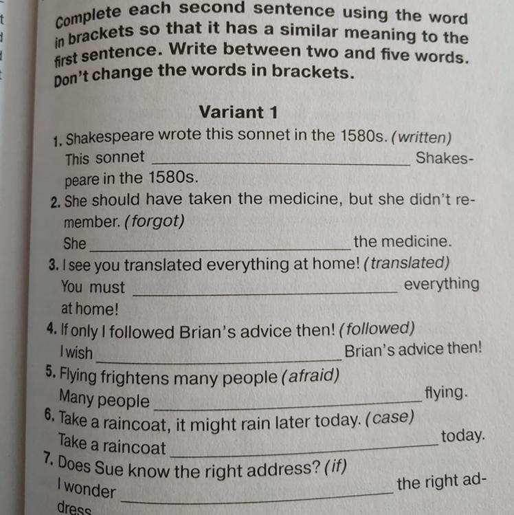 1.was written by.2.forgot to take.3.have translated.4.I have followed.5.are afraid of.6.in case it is rainy.7.if Sue knows.