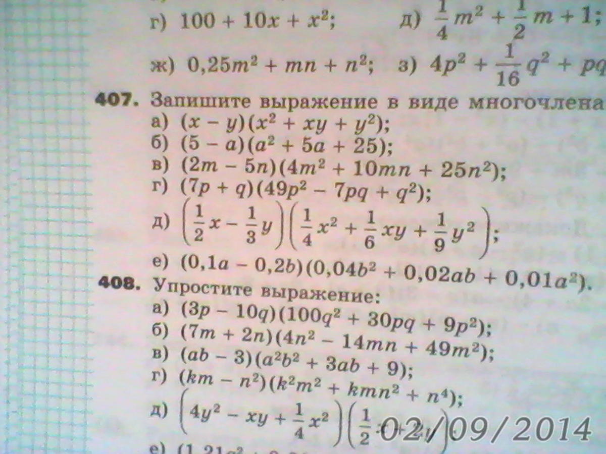407. а)х³-у³ б)125-а³ в)8m³-125n³ u) 343p³+q³ д)1/8x³-1/27y³ e) 0.001a³-0.008b³
