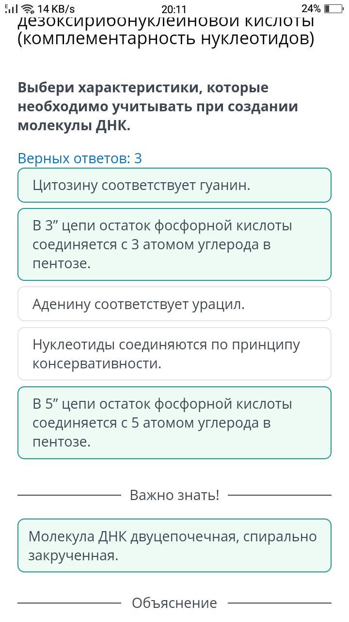 Моделирорование молекулы дезоксирибонуклеиновой кислоты (комплементарность нуклеотидов) Выбери характеристики, которые необходимо учитывать при создании молекулы ДНК. Верных ответов: 3 Цитозину соответствует гуанин. Аденину соответствует урацил. Нуклеотиды соединяются по принципу консервативности. В 3” цепи остаток фосфорной кислоты соединяется с 3 атомом углерода в пентозе. В 5” цепи остаток фосфорной кислоты соединяется с 5 атомом углерода в пентозе