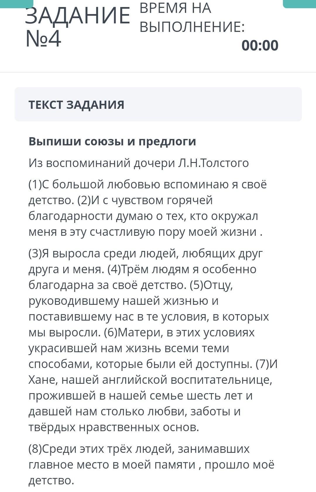 ТЕКСТ ЗАДАНИЯ Выпиши союзы и предлоги Из воспоминаний дочери Л.Н.Толстого (1)с большой любовью вспоминаю я своё детство. (2)И с чувством горячей благодарности думаю о тех, кто окружал меня в эту счастливую пору моей жизни. (3)Я выросла среди людей, любящих друг друга и меня. (4)Трём людям я особенно благодарна за свое детство. (5)Отцу, руководившему нашей жизнью и поставившему нас в те условия, в которых мы выросли. (6)Матери, в этих условиях украсившей нам жизнь всеми теми способами, которые были ей доступны. (7)и Хане, нашей английской воспитательнице, прожившей в нашей семье шесть лет и давшей нам столько любви, заботы и твёрдых нравственных основ. (8)Среди этих трёх людей, занимавших главное место в моей памяти, прошло мое детство. o