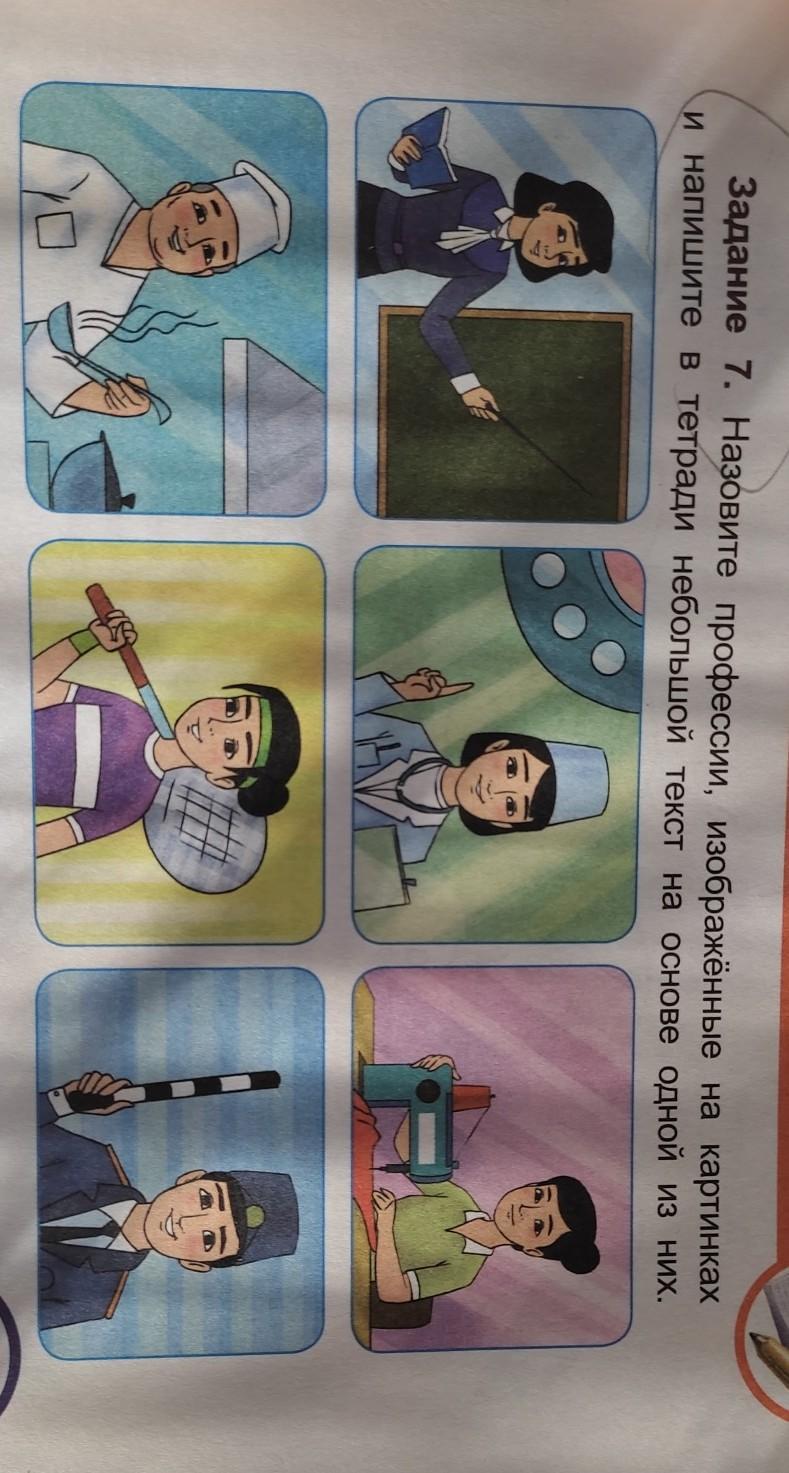 Задание 7. Назовите профессии, изображённые на картинках и напишите в тетради небольшой текст на основе одной из них. помогите пожалуйста