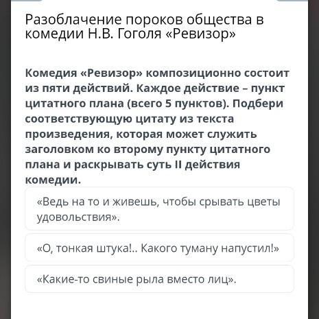 Разоблачение пороков общества в комедии Н.В. Гоголя «Ревизор» Комедия «Ревизор» композиционно состоит из пяти действий. Каждое действие – пункт цитатного плана (всего 5 пунктов). Подбери соответствующую цитату из текста произведения, которая может служить заголовком ко второму пункту цитатного плана и раскрывать суть II действия комедии. «Ведь на то и живешь, чтобы срывать цветы удовольствия». «О, тонкая штука!.. Какого туману напустил!» «Какие-то свиные рыла вместо лиц».