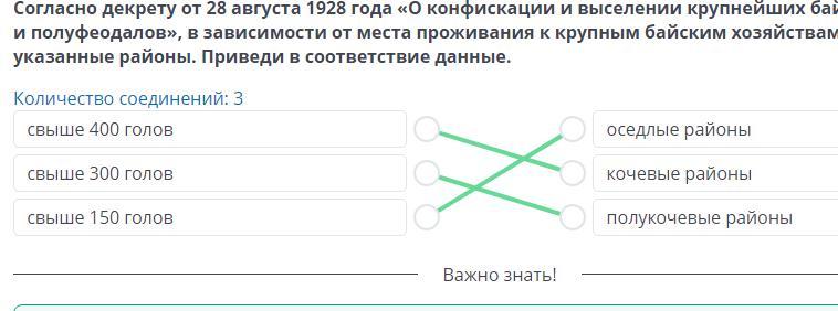 Согласно декрету от 28 августа 1928 года «О конфискации и выселении крупнейших байских хозяйств и полуфеодалов», в зависимости от места проживания к крупным байским хозяйствам относились указанные районы. Приведи в соответствие данные. Количество соединений: 3 свыше 400 голов____оседлые районы свыше 300 голов____кочевые районы свыше 150 голов_полукочевые районы
