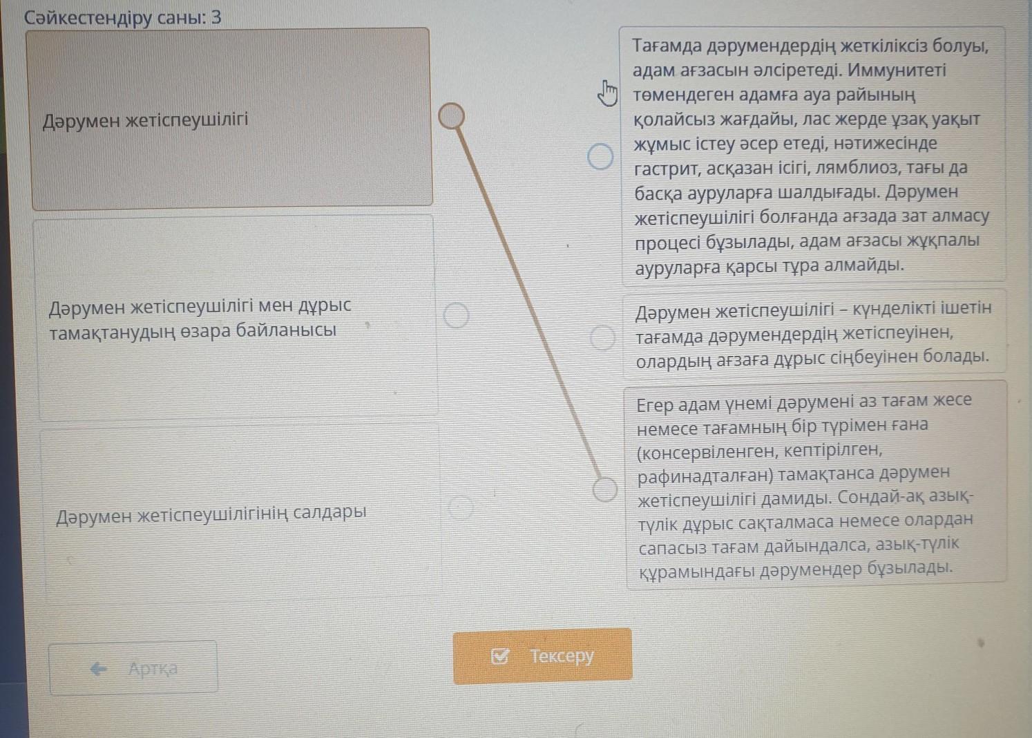 Сәйкестендіру саны: 3 Дәрумен жетіспеушілігі Тағамда дәрумендердің жеткіліксіз болуы, адам ағзасын әлсіретеді. Иммунитеті төмендеген адамға ауа райының қолайсыз жағдайы, лас жерде ұзақ уақыт жұмыс істеу әсер етеді, нәтижесінде гастрит, асқазан ісігі, лямблиоз, тағы да басқа ауруларға шалдығады. Дәрумен жетіспеушілігі болғанда ағзада зат алмасу процесі бұзылады, адам ағзасы жұқпалы ауруларға қарсы тұра алмайды. Дәрумен жетіспеушілігі мен дұрыс тамақтанудың өзара байланысы Дәрумен жетіспеушілігі – күнделікті ішетін тағамда дәрумендердің жетіспеуінен, олардың ағзаға дұрыс сіңбеуінен болады. Егер адам үнемі дәрумені аз тағам жесе немесе тағамның бір түрімен ғана (консервіленген, кептірілген, рафинадталған) тамақтанса дәрумен жетіспеушілігі дамиды. Сондай-ақ азық- түлік дұрыс сақталмаса немесе олардан сапасыз тағам дайындалса, азық-түлік құрамындағы дәрумендер бұзылады. Дәрумен жетіспеушілігінің салдары