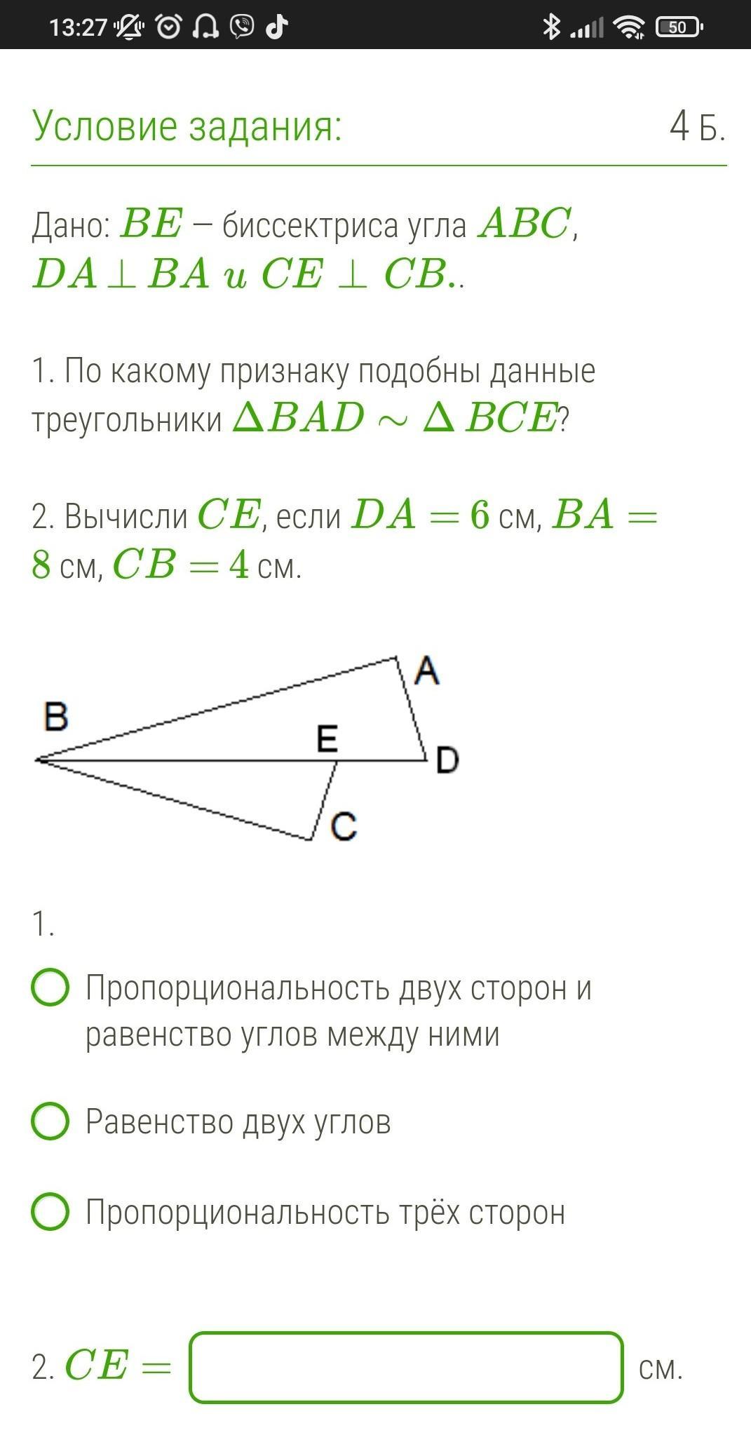 1)Равенство двух углов (∠ABD=∠EBC т.к. биссектриса BE делит ∠ABC, из которого выходит, на два равных и ∠BAD=∠BCE=90° т.к. перпендикулярные прямые DA⊥BA и CE⊥CB в точке пересечения всегда образуют угол в 90 градусов )