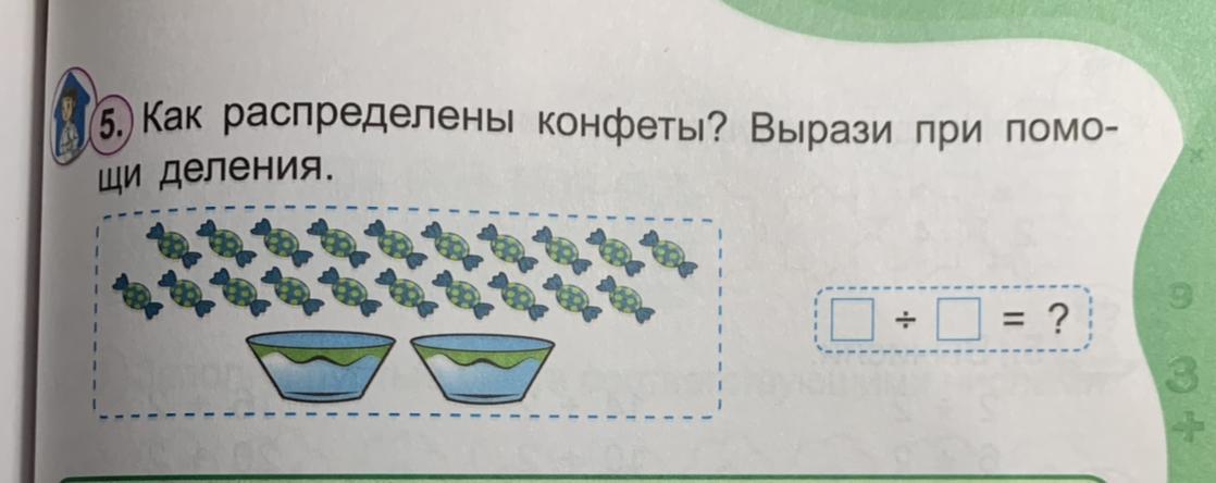 Так как там есть 20 конфет и 2 миски. Делить на два что бы было поровну.
