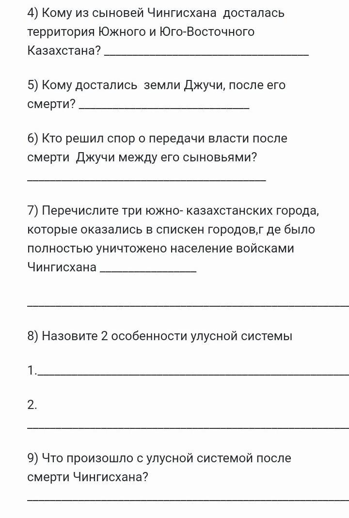 4) Кому из сыновей Чингисхана досталась территория Южного и Юго-Восточного Казахстана? ____________________________________