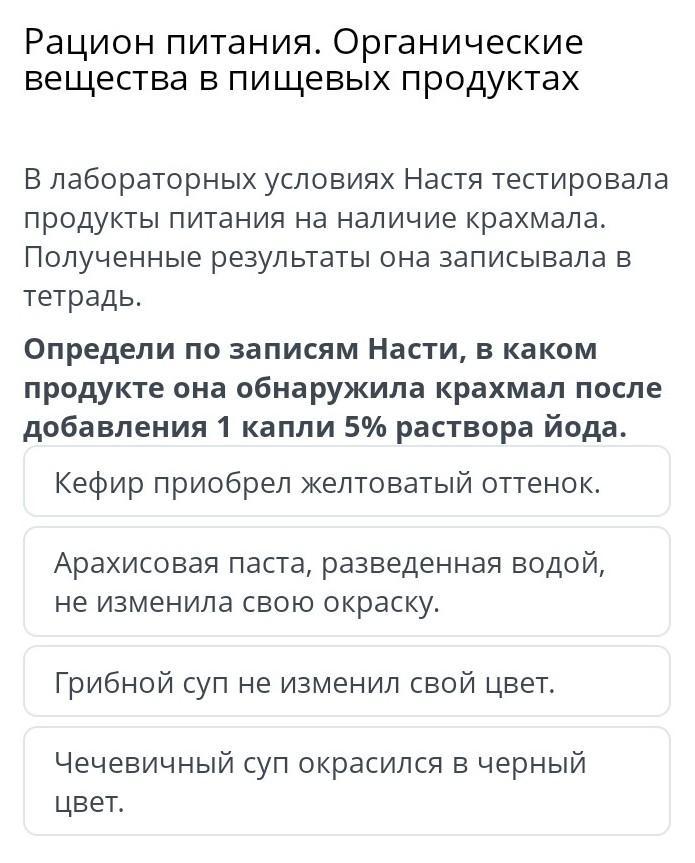 Рацион питания. Органические вещества в пищевых продуктах В лабораторных условиях Настя тестировала продукты питания на наличие полученный результат она записывала в тетрадь. Определи по записям Насти в каком продукте она обнаружила крахмал после добавления 1 капли 5% растворного йода. Кефир приобрел желтоватый оттенок. Арахисовая паста, разведенная водой, не изменила свою окраску. Грибной суп не изменил свой цвет. Чечевичный суп окрасился в черный цвет.