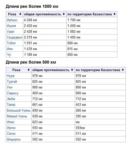 В Казахстане 85 022[источник не указан 150 дней] реки; из них 84 694 длиной до 100 км, 305 — до 500 км, 23 — длиной свыше 500—1000 км. Наибольшей густотой речной сети (0,4—1,8 км/км²) отличаются высокогорные районы Алтая, хр. Жетысу и Иле Алатау. Наименьшая густота речной сети отмечается в районах песчаных пустынь Приаралья и Прикаспия (менее 0,03 км/км²).