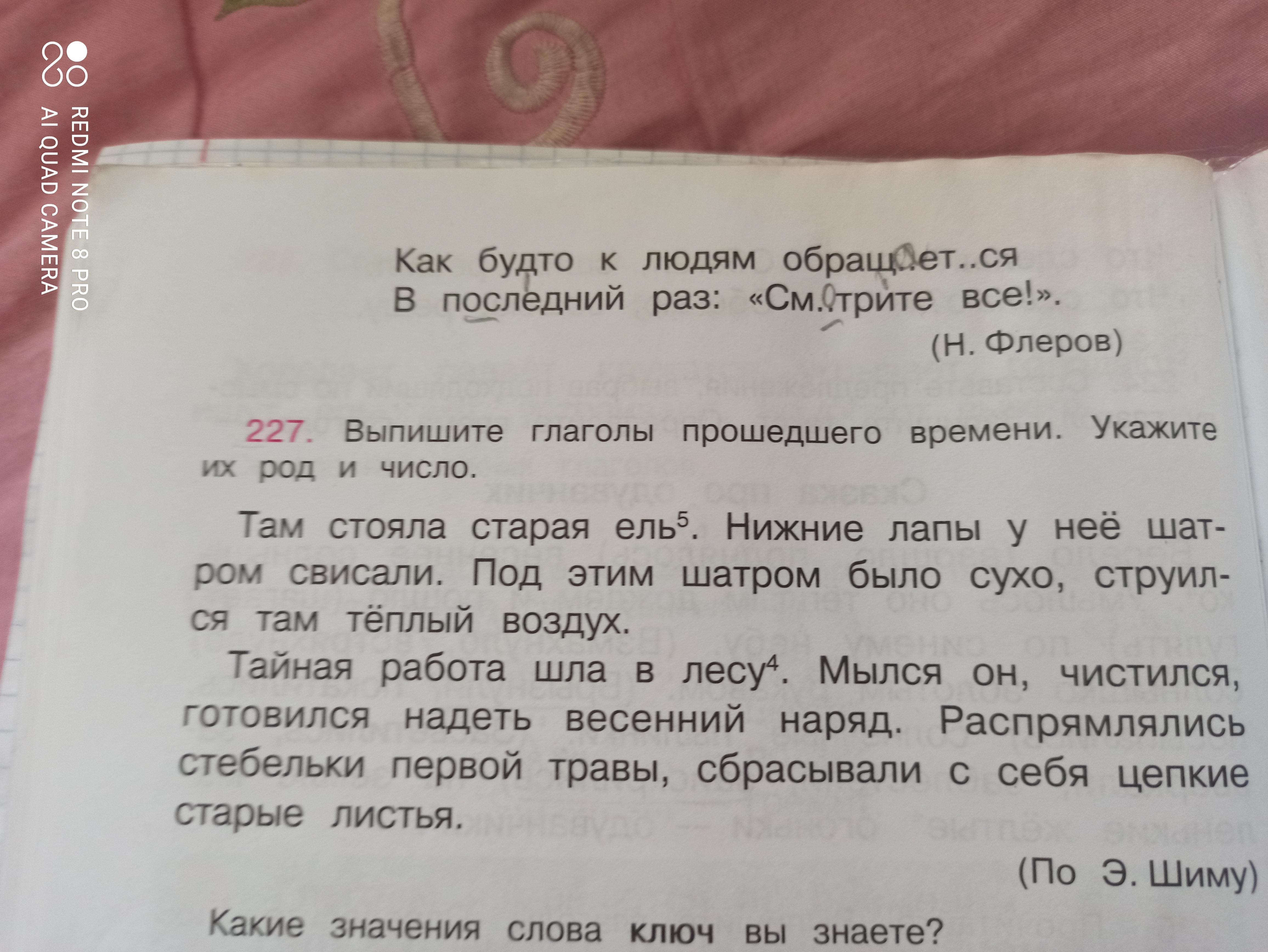 Стояла(ж.р, ед.ч), свисали(мн.ч), было(м.р, ед.ч), струился(м.р, ед.ч), шла(ж.р, ед.ч), мылся(м.р, ед.ч), чистился(м.р, ед.ч), готовился(м.р, ед.ч), распрямлялись(мн.ч), сбрасывали(мн.ч)