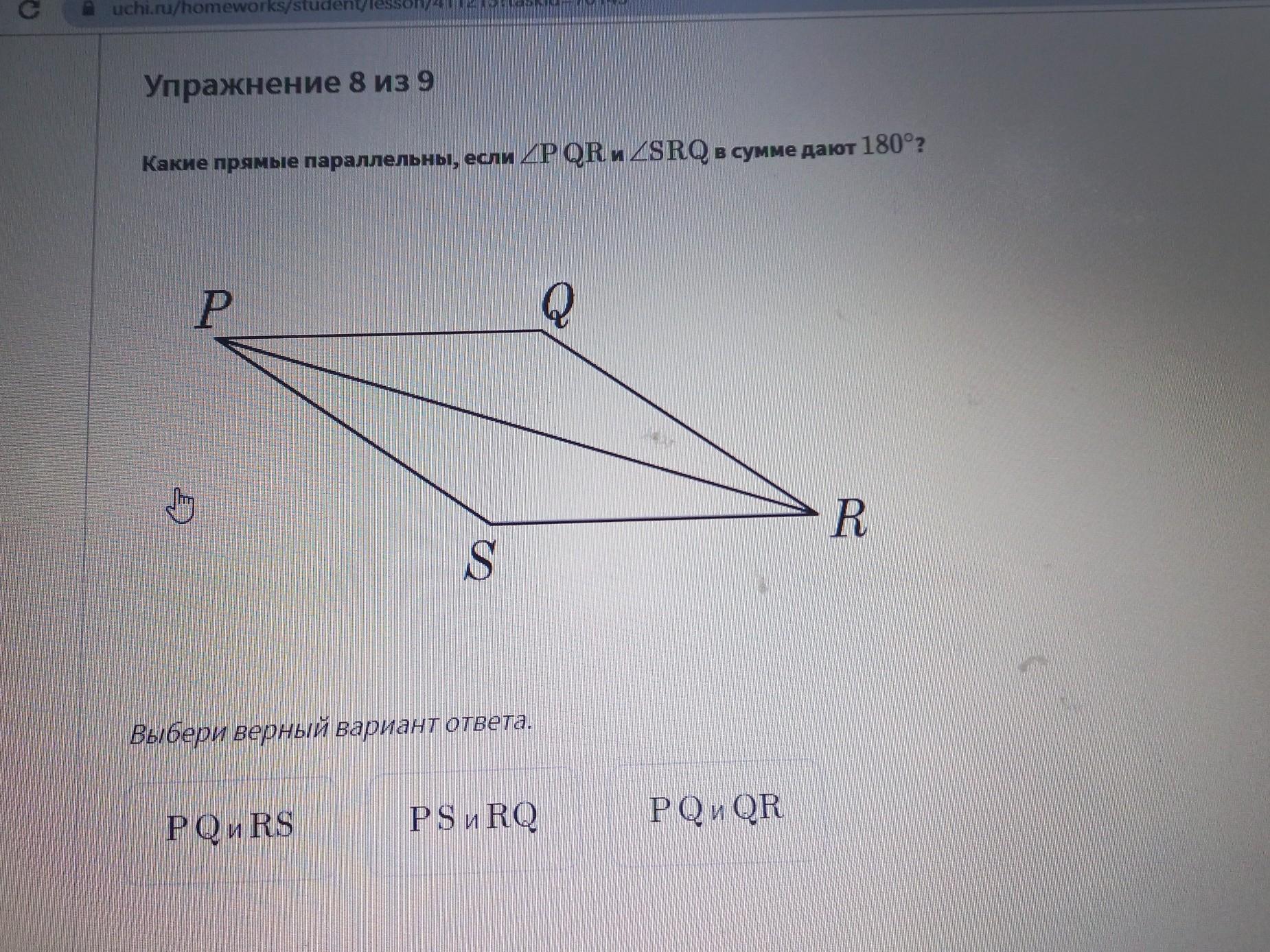 Какие прямые параллельны, если PQR и SRQ в сумме дают 180°? Р о R S Выбери верный вариант ответа. PQRS PSRQ PQи QR