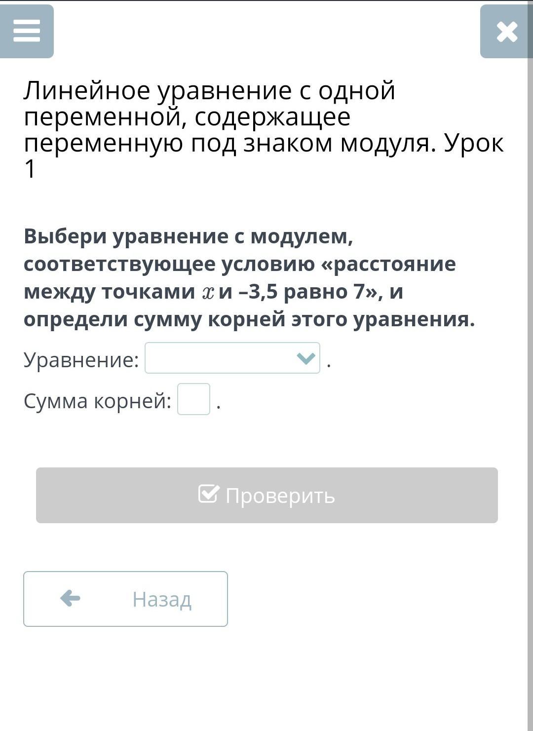 выбери уравнение с модулем, соответвующее условию "растояние между точками x и -3,5 равно 7", и определи сумму корней этого уравнения.