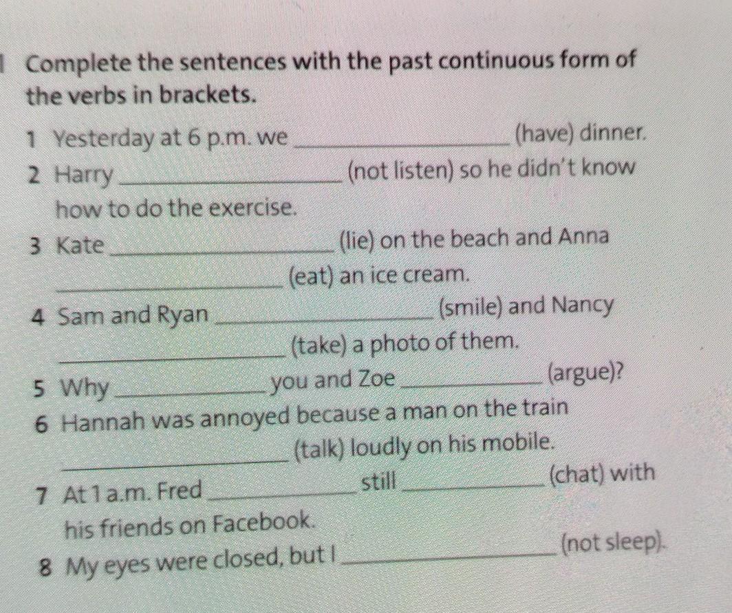 2 Harry | Complete the sentences with the past continuous form of the verbs in brackets. 1 Yesterday at 6 pm. we (have) dinner (not listen) so he didn't know how to do the exercise. 3 Kate (lie) on the beach and Anna (eat) an ice cream 4 Sam and Ryan (smile) and Nancy (take) a photo of them. 5 Why (argue)? 6 Hannah was annoyed because a man on the train (talk) loudly on his mobile, 7 At 1a.m. Fred still (chat) with his friends on Facebook. 8 My eyes were closed, but| (not sleep). you and Zoe