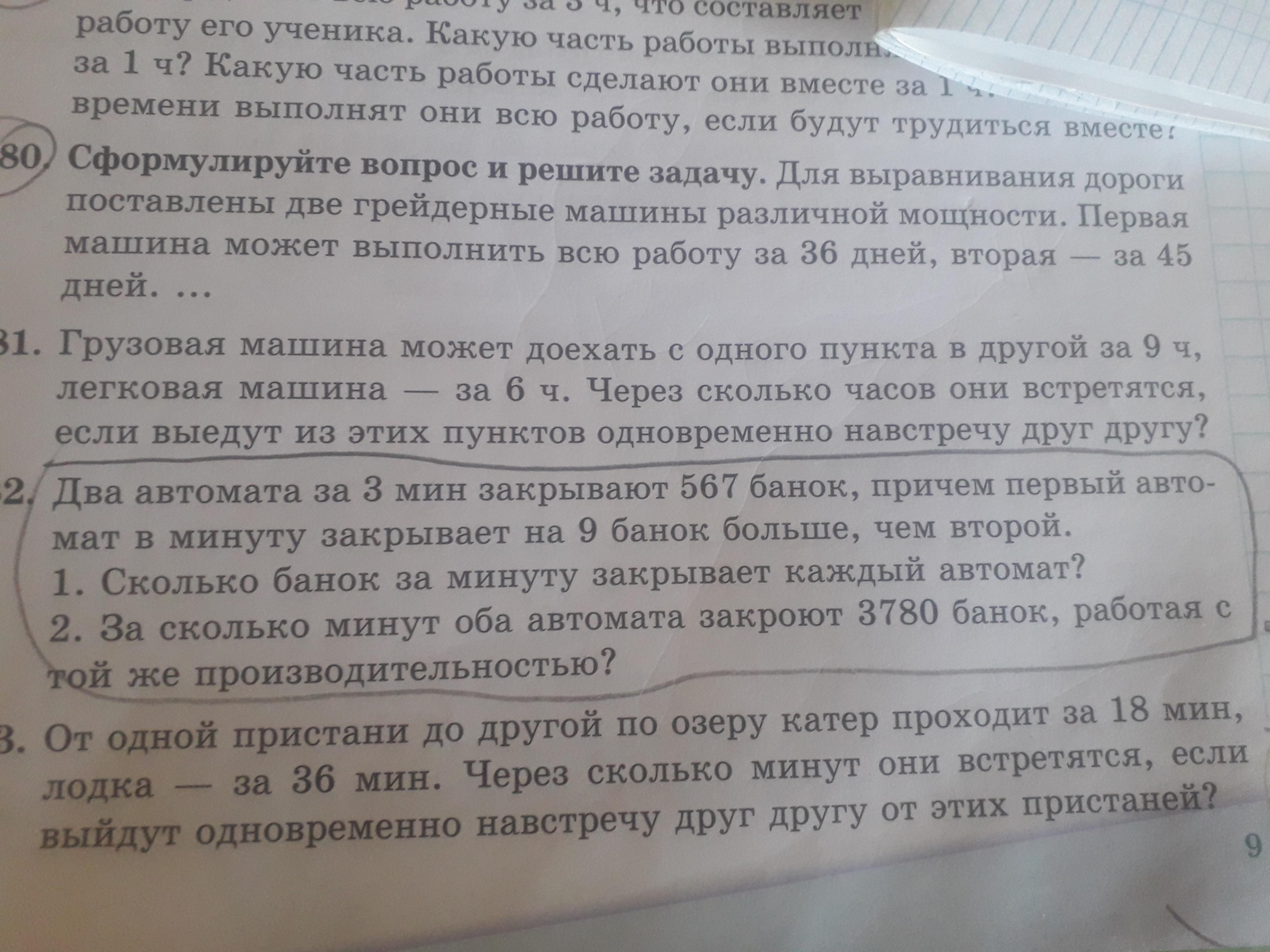 два автомата за 3 минуты закрывают 567 банок причем первый автомат в минуту закрывает на 9 банок больше чем второй . 1)Сколько банок за минуту закрывает каждый автомат? 2)За сколько минут оба автомата закроют 3780 банок работая с той же производительностью?