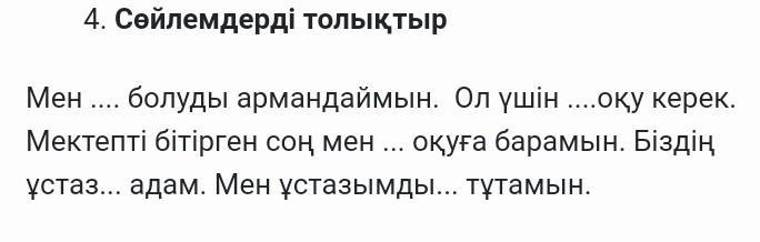 1мен... болуды армандайым.2 Ол үші ...тау керек. 3 мектепті бітірген соң мен ... оқуға барамын. 4 Біздің ұстаз... Адам. 5 Мен ұстазымды ... тұтамын пожалуйста срочно