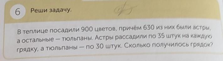 МАТЕМАТИКА В ЖИЗНИ 6 6 Реши задачу. . В теплице посадили 900 цветов, причём 630 из них были астры, а остальные — тюльпаны. Астры рассадили по 35 штук на каждую грядку, а тюльпаны — по 30 штук. Сколько получилось грядок? И ОТВЕЧАТЬ ФОТКОЙ С УСЛОВИЕМ ПОЖАЛУЙСТА СРОЧНО ПОКА МАМА НЕ ПРИШЛА