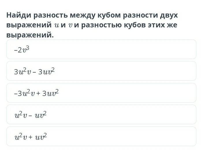 Куб суммы и разности двух выражений. Урок 2 Найди разность между кубом разности двух выражений u и v и разностью кубов этих же выражений. –2v3 3u2v – 3uv2 –3u2v + 3uv2 u2v – uv2 u2v + uv2