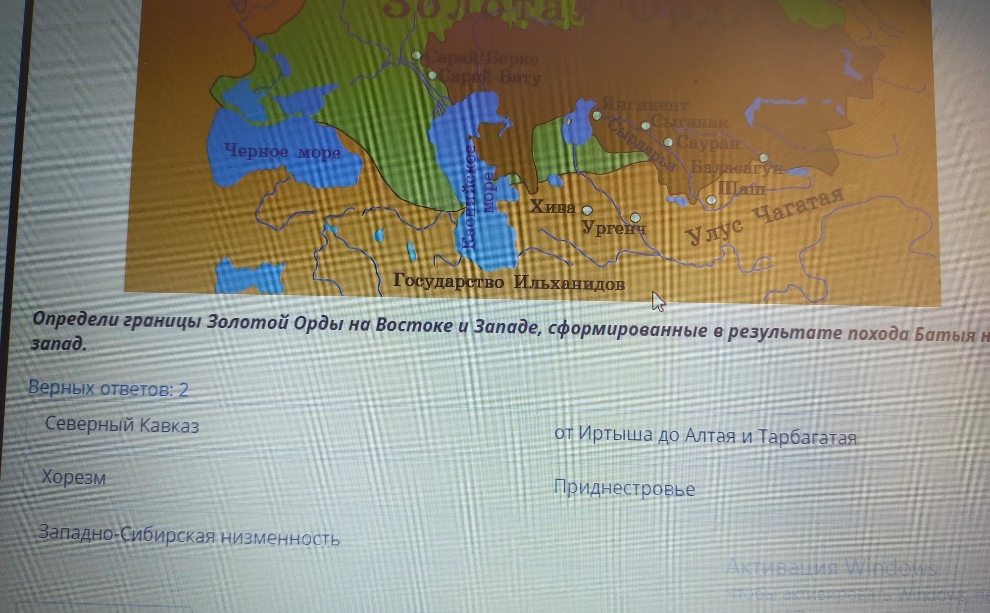 Х Золотая Орда Сырдарья Черное море ҮСарай-Берке Сарай-Бату Янгикент Сыганак Сауран Баласагун. Hain Хива Ургенч Касийское море Улус Чагатая Государство Ильханидов Определи границы Золотой Орды на Востоке и Западе, сформированные в результате похода Батыя на запад. Верных ответов: 2 Северный Кавказ от Иртыша до Алтая и Тарбагатая Хорезм Приднестровье Западно-Сибирская низменность Активация Windows Чтоб активировать Windows, перейд раздел "Параметры е Назад В Проверить