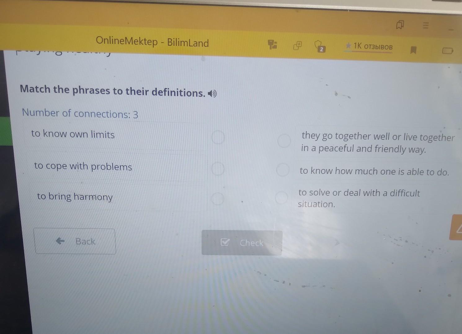 + nektep.org 1K отзывов Online Mektep - BilimLand 2 Match the phrases to their definitions.) view Number of connections: 3 to know own limits Ithy they go together well or live together in a peaceful and friendly way. to know how much one is able to do. to cope with problems to solve or deal with a difficult situation to bring harmony Check - Back 14.51