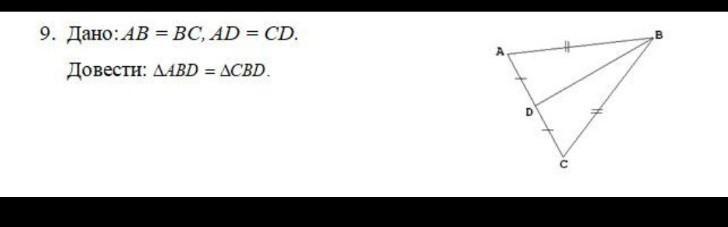 Роз-ня: Розглянемо трикутники ABD i CBD. AB=DC, AD=CD, BD- спільна; Отже, трикутник ABD=CBD, за 3 озн. рівності трикутників.