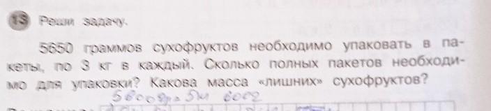 3 кг=3000 г., 5650:3000=1 (ост. 2650) полных пакетов 1, лишнее 2650 г. или 2 кг. 650 г.