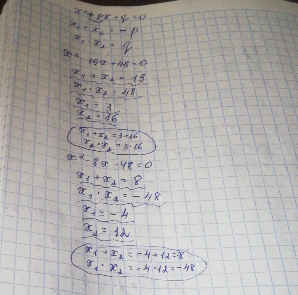 Объяснение сверху про теорему ВИЕТТА , а в кобках нахождение х1 и х2