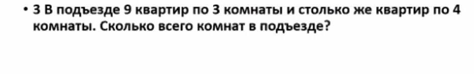 В подъезде 9 квартир по 3 комнаты и столько же квартир по 4 комнаты. Сколько всего комнат в подъезде?