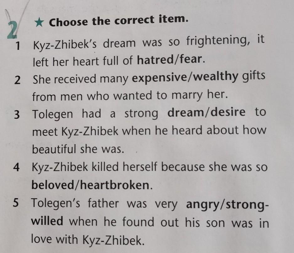 * Choose the correct item. 2 1 Kyz-Zhibek's dream was so frightening, it left her heart full of hatred/fear. 2 She received many expensive/wealthy gifts from men who wanted to marry her. 3 Tolegen had a strong dream/desire to meet Kyz-Zhibek when he heard about how beautiful she was. 4 Kyz-Zhibek killed herself because she was so beloved/heartbroken. 5 Tolegen's father was very angry/strong- willed when he found out his son was in love with Kyz-Zhibek.