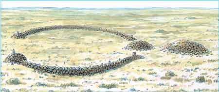 - 1 тип — когда с восточной стороны более крупного кургана строят один курган поменьше, а от малого кургана с восточной стороны отходит цепь — «усы»;2 тип — когда два кургана строятся рядом, в направлении с юга на север, а затем от обоих курганов в восточном направлении отходит, похожая на усы каменная дуга;
