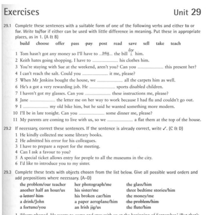 упр. 1,3 - заполнить пропуски подходящими глаголами, добавить to / for где нужно. упр. 2 - исправить ошибки, если они есть
