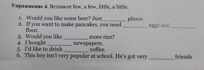 Few / little означают "мало", "недостаточное количество чего-то" и имеют отрицательный оттенок. Few используется с исчисляемыми существительными во множественном числе. Little используется с неисчисляемыми существительными.